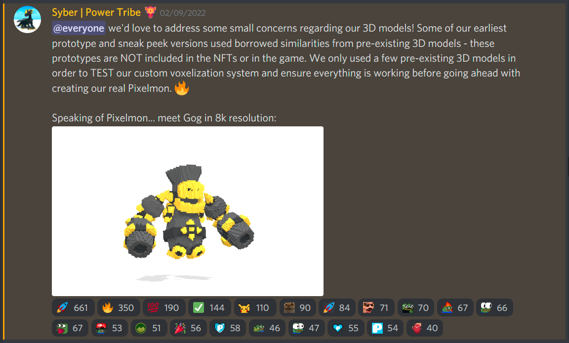 The Pixelmons Hatching, or metadata reveal, took place on Friday, Feb. 25th. Yet weeks prior, the project’s team was already fielding concerns that their NFTs would be reused 3D voxel models, e.g. the kinds you can buy on model marketplaces for dozens or hundreds of dollars. At the time, Syber was adamant they weren’t using any prototypes.