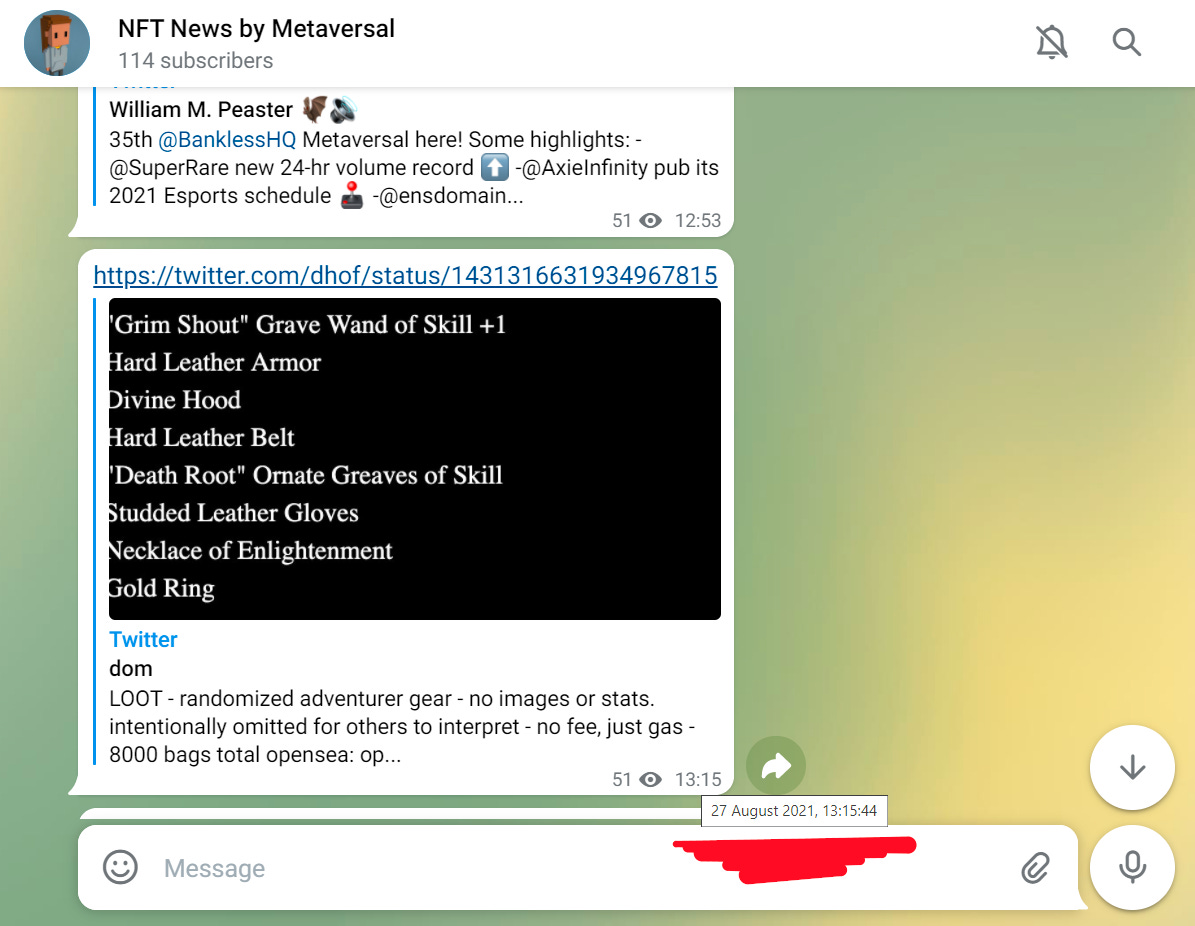 💬 Join the Metaversal Telegram channel, where I publicly compile news highlights for my weekly Friday recaps. Last week I pinged the chat about Loot just 2 hours after the project launched! 👀