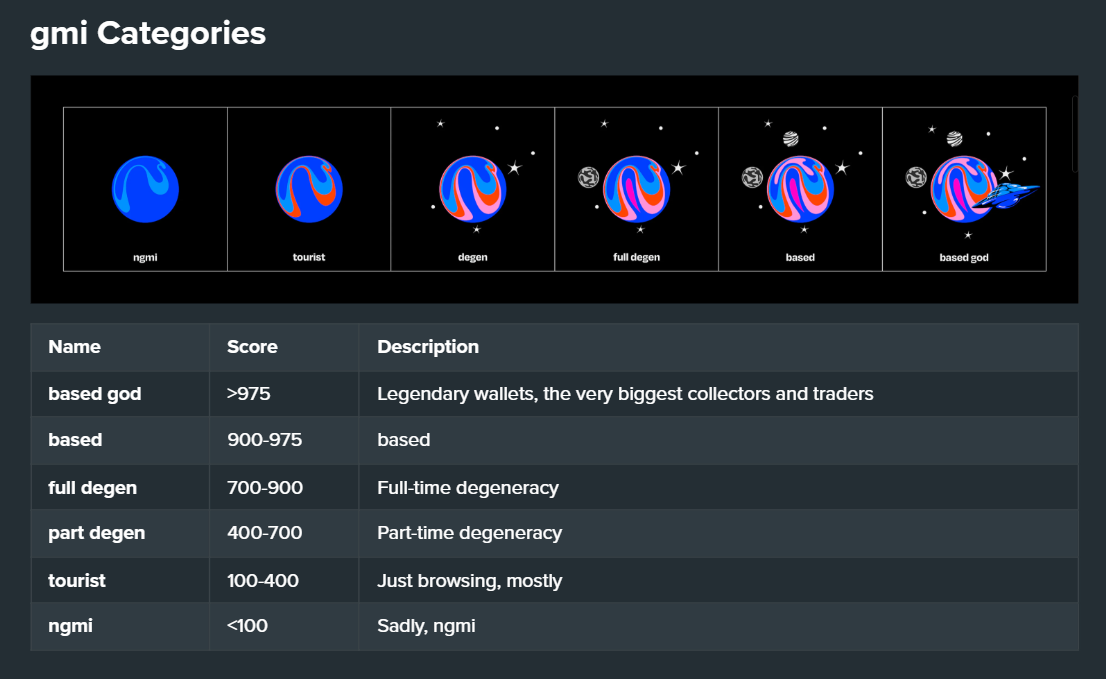 The calculation of gmi is based on a multitude of factors, including realized and unrealized gains, the number and volume of transactions, the quantity and quality of NFTs owned, a wallet's age, and the number of collections owned. Scores are tracked across six levels, ranging from "based god" for scores above 975 to "ngmi," i.e. not gonna make it, for scores below 100.Â