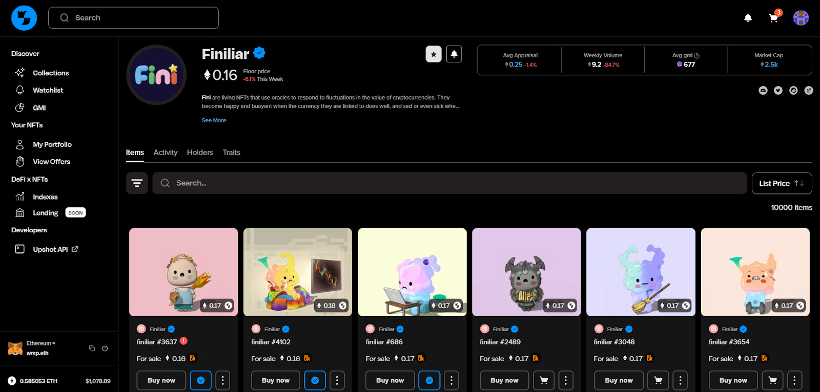 Once youâre on a specific collection, the individual listings will show the NFT number, the sales price, and Upshotâs appraisal price, and you can choose from âBuy Now,â âAdd to Cart,â or âMake Offerâ options here. You can also click into a collectionâs âActivity,â âHolders,â and âTraitsâ tabs to dive deeper into stats and trading trends.Â
