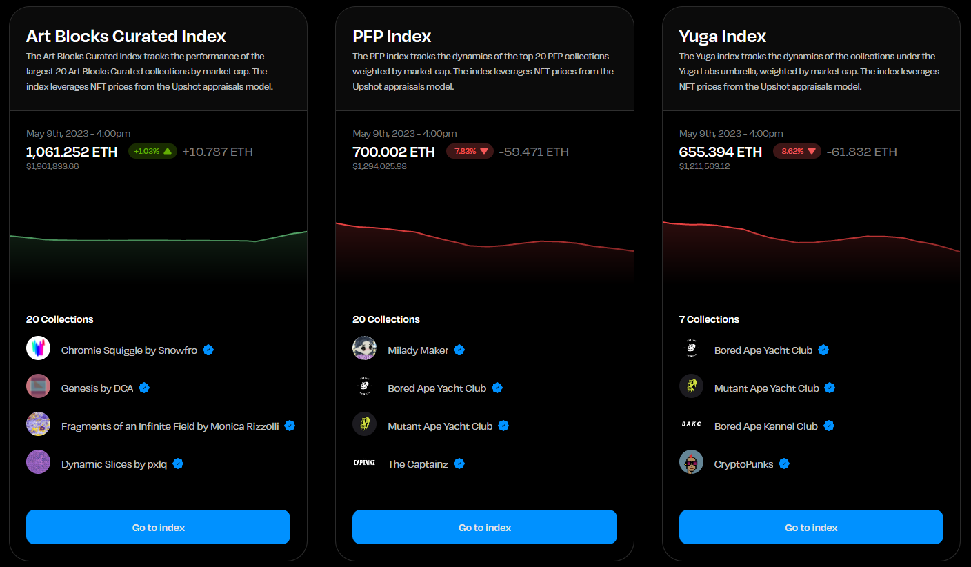 Developed from a suite of custom NFT index methodologies, these initial indexes track major segments of the NFT market. The Upshot Yuga Index monitors collections under Yuga Labs, e.g. CryptoPunks and BAYC, capturing some of the most liquid NFT collections, while the Upshot Art Blocks Curated Index tracks the top 20 Art Blocks Curated NFT collections, and the Upshot PFP Index tracks the top 20 profile picture collections.Â