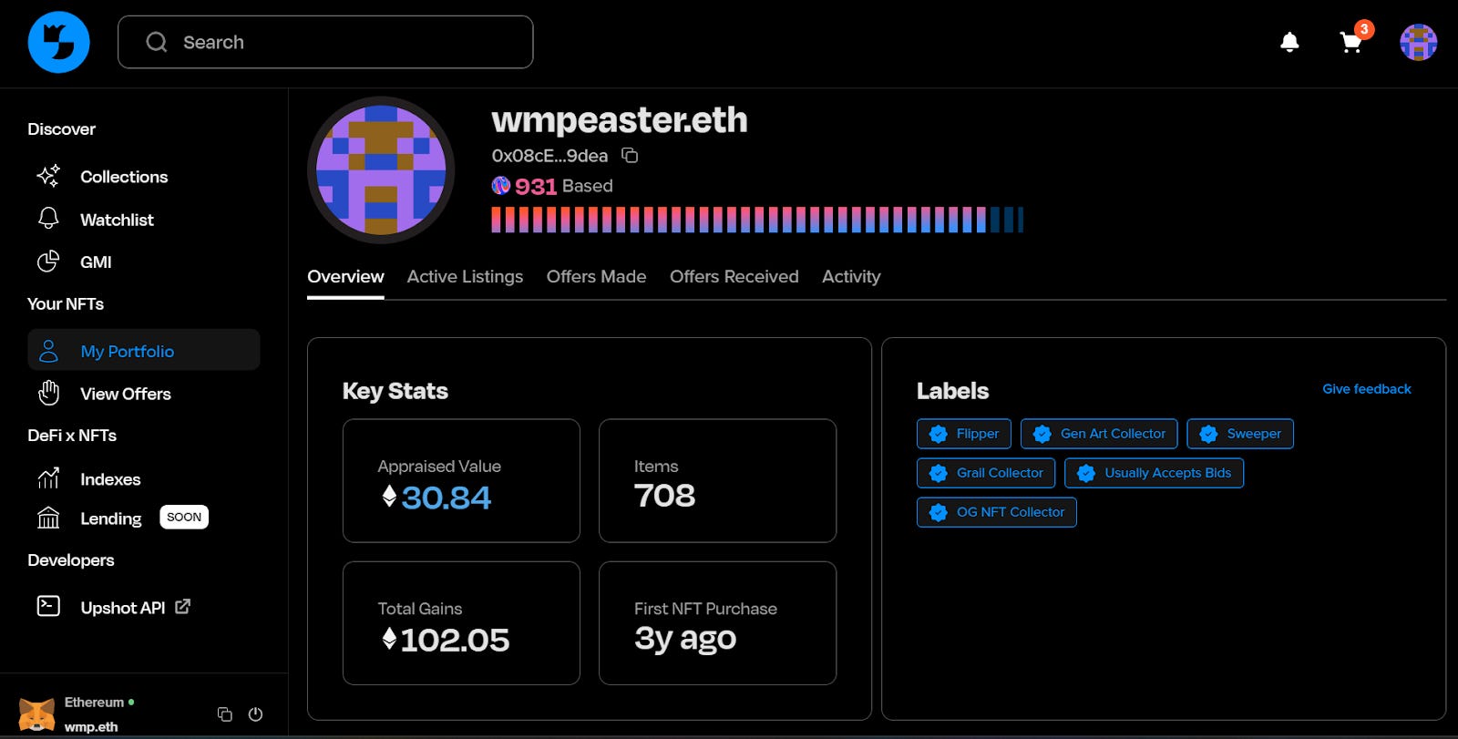 Beyond a marketplace aggregator and the gmi score, Upshot also offers a âMy Portfolioâ tab where you can get a birdâs-eye view of info about your portfolio, from key stats to wallet labels. Itâs here that you can also review and manage your current active NFT listings and offers.Â